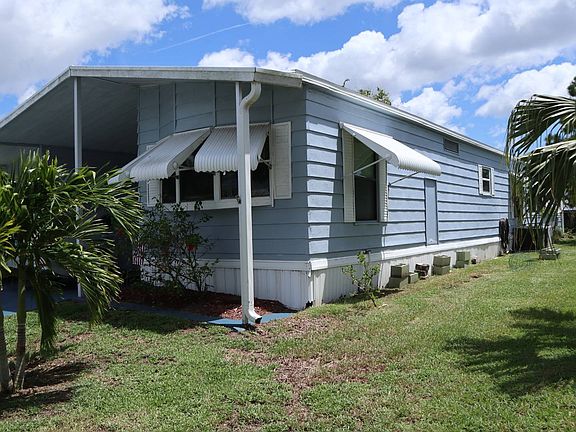 BEAUTIFUL PARTIALLY FURNISHED WATERFRONT HOME IN SPANISH LAKES EXTERIOR: This home features an asphalt shingle roof that was replaced 7 years ago, and aluminum siding. Great location with a beautiful lake in the backyard. All the windows in this home have hurricane shutters and were replaced 3 years ago. The house and driveway were painted a lovely blue color and really appeal to the eye. The home also features a gorgeous Florida room, as well as an outdoor patio area.. Perfect for grilling and enjoying the breeze! This home is in immaculate condition, and certainly one you do not want to miss out on! INTERIOR: Laminate flooring, cathedral ceilings, an air conditioned Florida room, year old carpet in the bedrooms, and a beautiful view.. along with a less than 8 year old roof as well as new windows are all great features of this home. The big open living room, breakfast/dining area, and the kitchen are all in the center of the home.. With the master and guest rooms on opposite ends. Home comes partially furnished, exclusions apply. Interior washer and dryer. KITCHEN: The kitchen is located in the center of the home and comes equipped with a ton of cabinet and counter space, and has laminate flooring. The kitchen is spacious and comes with all the appliances including microwave, stove, fridge, and dishwasher. MASTER BEDROOM: The master bedroom will easily accommodate a king size set, and is located at the end on the home. The master bathroom suite features a new sink/vanity and a door separating the shower and toilet. Carpet is one year old BEDROOM 2: The second bedroom has enough room to accommodate a queen size bedroom set. Just outside of this beautifully painted room is the guest bathroom which is full size and features a shower/tub combination. Carpet is one year old. FLORIDA ROOM: This room is certainly a major feature of the home. Sitting at the end of the home is this beautiful florida room that overlooks the lake in the backyard, and it has access to the back patio. The air conditioned room is sure to be the hot spot for anyone living here and will most likely be where most of the time is spent, The interior laundry room is located just off to the side in this room This is such a beautiful home and one that you surely do not want to miss out on! CABLE: Comcast, Direct TV WATER AND SEWER: Indian River Utilities ELECTRICITY: Florida Power and Light APPLICATION REQUIREMENTS: Able to show three times the amount of the lot rent , no pets , and must be 55+. AMENITIES: Pool, sauna, fitness room, library, billiards,craft room, bocce, shuffleboard, pickleball, tennis and an 9 hole golf course. SPANISH LAKES is a friendly 55+ active community, quiet location, with easy access to I95. Fort Pierce is located on the Treasure Coast and is a 15-20 minute drive to the beach. Close access to shopping , restaurants , and much more. Come and see for yourself....