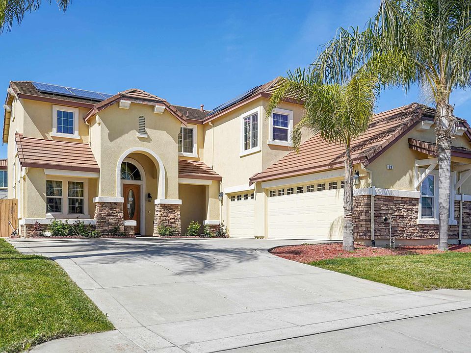 Situated in the serene city Of Oakley, California, 23 Escher Circle is a charming abode nestled in a quiet cul-de-sac, just a short stroll away from a tranquil water body, a baseball field, and delightful playgrounds. Boasting an open concept design, this home features a convenient full bathroom and bedroom on the ground floor, making it perfect for guests or multi-generational living. The property also offers a spacious three-car garage and a sizable driveway providing ample parking space. Equipped with multiple solar panels, this home is not only energy-efficient but environmentally conscious as well. The master suite is a true sanctuary, featuring elegant French doors, a luxurious soaking tub, and a generously sized walk-in closet. Step outside to a resort-style pool and spa, offering a perfect retreat for relaxation and entertainment. The chef's kitchen is well-appointed with high-end appliances and a central island, ideal for culinary enthusiasts. For those who enjoy hosting gatherings, the home also includes a large formal dining area, complemented by beautiful bamboo floors that flow throughout the residence, adding warmth and sophistication to the space. Don't miss the opportunity to experience the perfect blend of comfort and luxury at 23 Escher Circle