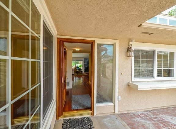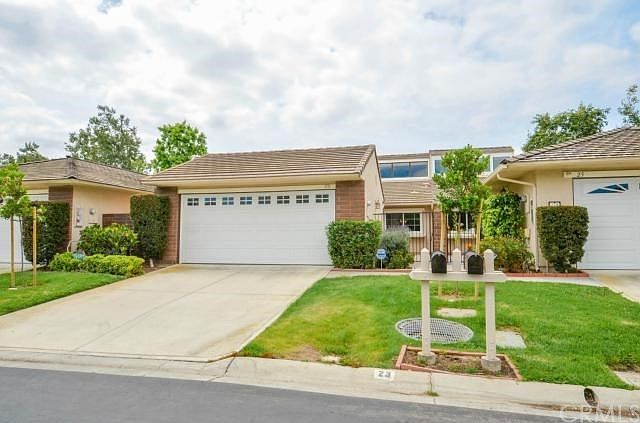 This home has a quiet interior location which backs to a greenbelt. Pride of ownership throughout. Enter this upgraded 1-story home through a private gated courtyard. There is a custom oak front door with leaded glass and retractable screen. Cherry wood flooring through the foyer, living area and both bedrooms. Cathedral ceiling and high windows allows ample light throughout. Fireplace in living room and replacement windows and doors throughout with custom blinds. Remodeled kitchen has white cabinets, quartz countertops and recessed lighting. Master suite has walk-in shower and closet with built-in drawers. 2nd bath is also remodeled with upgraded flooring and pedestal sink. Attached two car garage with built-in cabinets and work bench. Walk to pool, spa, park and shopping.