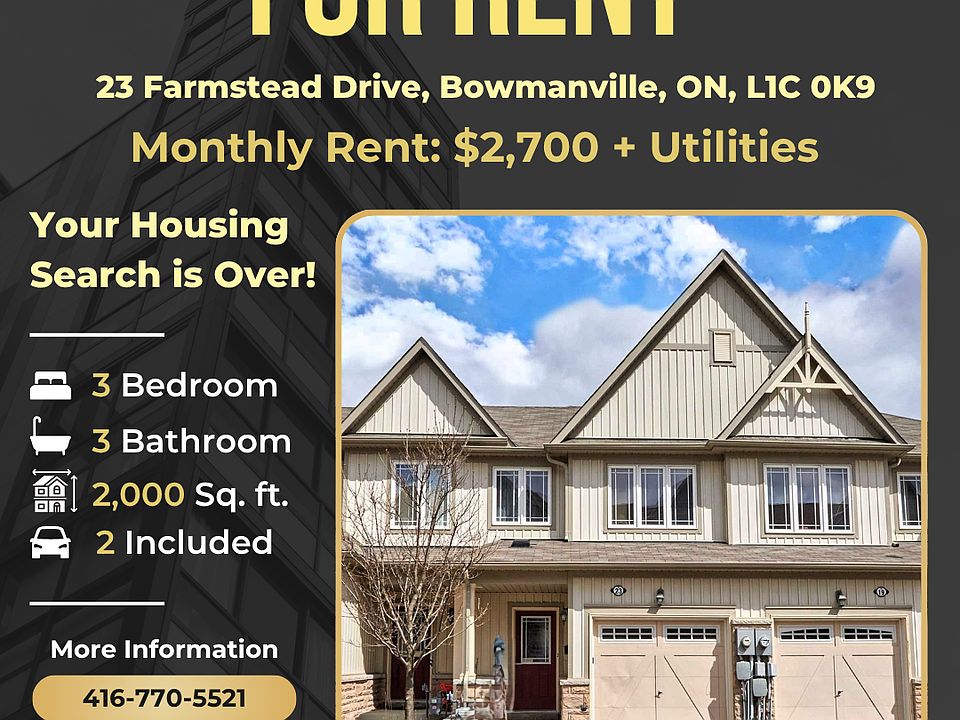 Outstanding 3-Bedroom Townhouse (3 Bed, 3 Bath) Address: 23 Farmstead Drive, Bowmanville, ON, L1C 0K9Monthly Rent: $2,700 + UtilitiesAvailable: September 1, 2025Square Feet: 2,000Size: 3 Bed | 3 BathProperty Type: Freehold Townhouse Parking: IncludedWelcome to 23 Farmstead Drive an outstanding 3-bedroom townhouse nestled in one of Bowmanville's most vibrant and family-oriented communities. Perfectly designed for young families or professionals seeking space and comfort, this beautifully maintained home offers a warm, welcoming layout and a partially finished basement with flexible living potential.Property FeaturesSpacious open-concept layout filled with natural lightModern kitchen with granite countertops and breakfast barPrimary bedroom features a walk-in closetThree bathrooms, including a convenient 2-piece ensuite in the basementPartially finished basement with a rec room that can serve as a 4th bedroomPrivate driveway and attached garageFenced backyard ideal for relaxing or entertainingNeighbourhoodLocated in a thriving Bowmanville neighbourhood, this home is just minutes from excellent schools, beautiful parks, public transit, and a wide range of shopping and dining options. The community is growing quickly, making it a prime spot for families looking for long-term value and a place to settle in.Don't miss your chance to live in this fantastic home in a location that truly has it all. Whether you're upsizing or planting new roots, 23 Farmstead Drive offers the perfect blend of comfort, convenience, and community living. Book your viewing today Utilities not included Application Process:Digital Rental ApplicationPhoto Identification RequiredRecent Credit Report (Equifax or TransUnion)Income Verification (Job Letter, Pay stubs, T4 etc.)Rental History VerificationFirst & Last Months' Rent Deposit Required Upon SigningPet Friendly: Yes