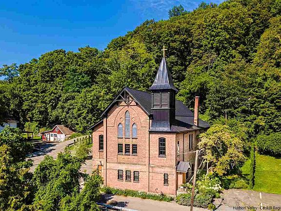 Metropolitan sophistication meets Hudson Valley paradise. Positioned on a hilltop in the understated cool waterfront of the Roundout enclave in downtown Kingston, New York, 23 Fitch stands guard. Built by a collective of local Irish artisans in the late 19th century, this meticulously restored sanctuary pays homage to New York's noble past. A matte black metal roof lies atop the original tin shingles, highlighted by custom copper gutters and impressive concrete French ground drainage. The 7,000 square foot refuge features a SoHo loft-style open plan boasting state-of-the-art energy efficient heating, plumbing, and electrical systems. The vaulted ceilings upstairs produce rich and pure acoustics. Downstairs, the superb chef's kitchen features an eight-burner Viking stove, Subzero refrigerator, granite countertops, and walk around island that generously opens onto a large living and dining space, with Art Deco lantern fixtures from Manhattan's iconic Russian Tea Room. An alluring sleep chamber awaits behind two commanding metal barn doors from a warehouse in Queens, and a full bathroom, completed with 18th century French floor tiles, sits across the way. This three-bedroom residence features state-of-the-art security, including high definition all-side camera views. Broad black premier Marvin windows, custom cut into the thick stone, flood original hardwood floors with promising new light. A generator and commercial grade breakers give peace of mind, even in the worst storms. This live-work utopia overlooks a second-generation industrial shipyard on the meandering Roundout Creek. Forty-five trees, vivid grasses, and a smattering of crisp limelight hydrangeas decorate the generous hilltop double lot. 23 Fitch rests with respectful permanence on a hushed limited-access cul-de-sac, south of downtown Kingston's walkable restaurant scene, quaint shops, and boat-laden waterfront. This airy and vast space beckons individual or collective creativity!