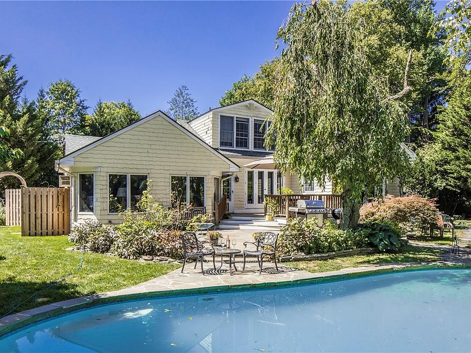 Stay-cation at home! 23 Glen Washington in the heart of the Lawrence Park West enclave of Bronxville PO/Yonkers offers a third of an acre of consummately private and well landscaped property with one of the prettiest in ground pools around. All this a very short distance from Bronxville village shops and train. Originally built as a one story ranch with three first floor bedrooms, this charming mid century stone and shingle home now has all the right rooms for easy living. Beyond the charming step down living room with fireplace and built-ins, the open plan dining room with French doors to a lovely deck adjoins a well appointed kitchen with granite island. The generously sized family room with vaulted ceilings provides lovely views of the pool and stone patio. A well located mud/laundry room provides easy access to the 2 car garage. In addition to the first floor primary BR/ bath and 2 BRs with hall bath, the second floor now offers a private en suite BR and bath. Central air too. Won't last!