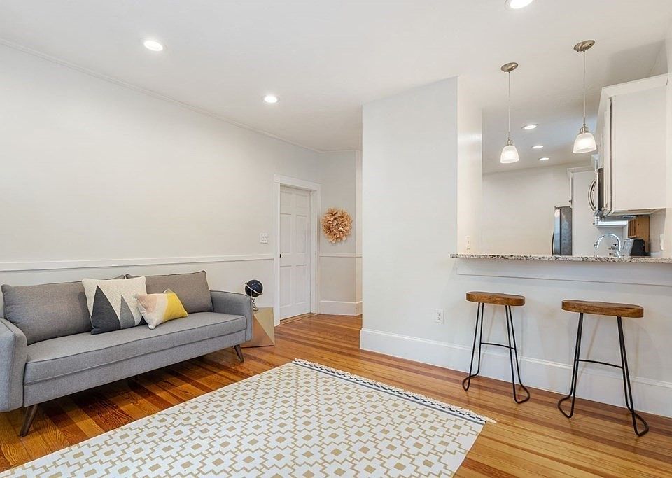 This is your chance to own in West Roxbury. You’ll love the location of 23 Goethe #1 on a tree-lined street, minutes drive to Roslindale Square and Legacy Place in Dedham, with easy access to Downtown Boston. The condo fee is low, making this an amazing value and great investment opportunity. You’ll be thrilled by the large living room with a bay window and recessed lighting. It flows into the open kitchen; featuring a breakfast bar, pendant lights, granite countertops, stainless steel appliances and ample cabinet space. The minimalist bedroom has a built-in bookcase for extra storage. The second bedroom/office is a wonderful addition.The bathroom features white tile flooring and tub surround. This entire unit has high ceilings and wood floors, it was extensively renovated in 2016. This immaculate renovation has clean lines, silver fixtures, and tons of basement storage with private laundry. The rear of the unit overlooks a brand new deck using all new vinyl railings and Trex decking.