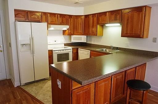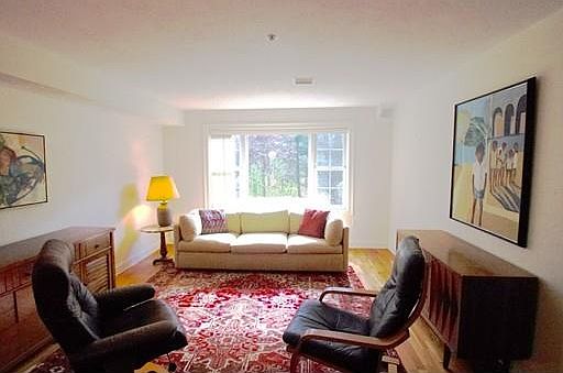 First floor, corner unit Greenleaves condo (a 55+ community) with lovely wooded view in a peaceful location with plenty of parking and a side door for easy access to the unit. In excellent condition, the condo includes cherry laminate wood floors and solid cherry wood cabinets, a master bedroom with windows on two sides for extra light and an in-unit washer and dryer. The main living area is an open floor plan and combines the U-shaped kitchen with breakfast bar, an area for a dining table and a good sized living room. Off the living room is another bedroom that could be used as an office or library. There is also common space available for owners including a library/game room, sitting area with gas fireplace and a large gathering space with a kitchen, tables and sofas for parties, functions and gatherings. A communal deck in the back is ideal for the warmer months. Great value and close to shopping, bike path and downtown Amherst!