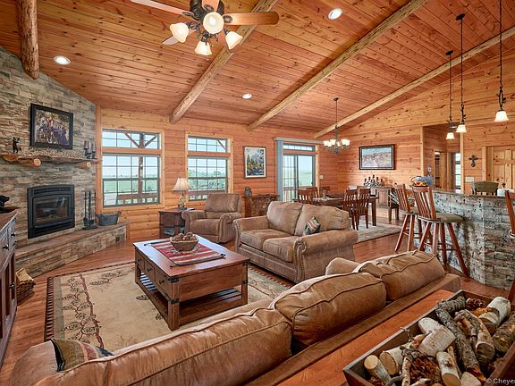 40 acres of pure Wyoming wild and free county bliss. This is a rare opportunity to find a home and land as spectacular as this and with no covenants. This log home has a wraparound deck to accentuate the mesmerizing views from all directions including views of the Rockies. Upon entering the home, the foyer sets the stage for what proves to be a grand tour. The large living room with dramatic fireplace has the ambiance of a wonderful lodge retreat. There is also a smaller living room, with another gorgeous stone fireplace, perfect for reading or TV viewing. There are a total of 4 bedrooms, 3 bathrooms, a gorgeous kitchen, spacious dining with access to the wraparound deck and views of the gardens below, a fabulous laundry room with storage cabinets and sink, an oversized 2-car heated garage and a 32x42 detached 2 car garage with workshop and pellet stove. The interior and exterior pictures speak volumes as to the beauty and well thought out design of this unique and inspiring home. There is so much more to share, so we invite you to contact us for further information and features about this captivating home.