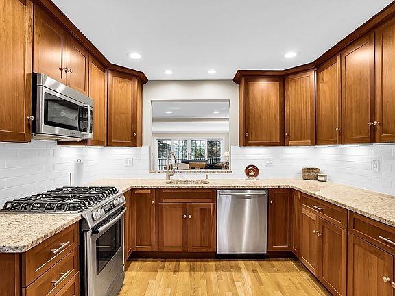 Welcome to The Village at Highland Park! Charming courtyard w brick walkway leads to covered porch inviting you into an upscale 2 bedroom, 2.5 bath, ~2400 sq. ft. townhome w walkout, finished lower level. Renovated, custom kitchen w high quality cherry cabinetry, Bosch SS appliances, gas range, subway tile backsplash & lighting. Spacious dining & family room with elegant corner fireplace & 4 panel French doors open to expansive composite deck overlooking stunning grounds w sunset views. Upstairs, 2 vaulted bedroom suites w renovated private baths, walls of windows w custom plantation shutters & closet systems. Primary suite's bath showcases glass & tile shower, stand-alone tub & cherry vanity with dual sinks set in quartz counters. Renovated 2nd bath with cherry vanity & tiled tub & floors. 2nd floor laundry room. Gleaming hardwood floors! High efficiency HVAC & extra insulation. Garage w storage & deeded parking. One mile to commuter rail, quick access to 9/90/495. Top-ranked schools!