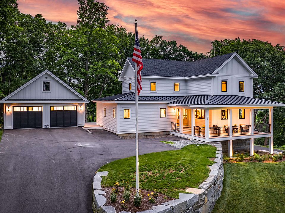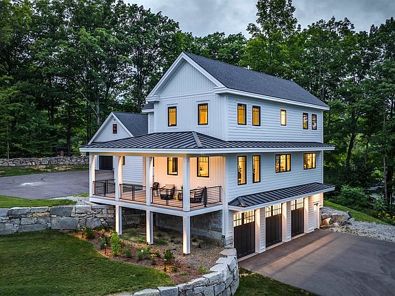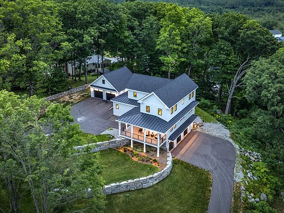 This like-new modern farmhouse offers a walk-to-town location perched above downtown Meredith, with elevated views of Lake Winnipesaukee and easy access to shops, restaurants, and waterfront. Step onto the expansive front porch and into a foyer where high ceilings and hardwood floors flow throughout the open-concept kitchen, dining, and living areas. Arched openings, transom windows, and abundant natural light—create a warm, timeless feel. The kitchen features antique-inspired Big Chill appliances, Cambria quartz counters, center island with bar seating, and farmhouse sink. The main-level primary suite includes a spacious walk-in closet and a luxurious bath with a zero-entry shower, heated tile floors, soaking tub, and a cement dual-sink suspended vanity. A powder room, laundry, and rear entry from the detached, climate-controlled two-car garage complete this level. A bright four-season porch opens to the backyard deck—ideal for entertaining or quiet mornings with lake views. Upstairs offers two view-facing bedrooms, a shared full bath, and a dedicated office or additional sleeping space. The lower level provides three temperature controlled additional garage bays and abundant storage, with the potential to finish for additional living space. Outside, find stone retaining walls, thoughtful plantings, irrigation, and lighting. This home is sold with some furnishings and the option to purchase a nearby 30' boat slip for convenient access to Lake Winnipesaukee.