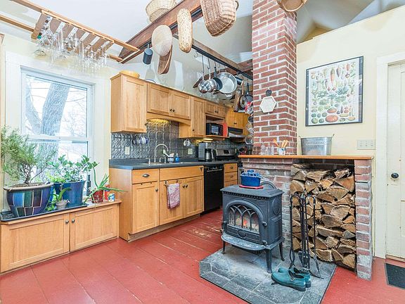 An in-town New England farmhouse with a country kitchen renovated in 2005, adding handsome pecan cabinetry, traditional tin back-splash above the counters, built-in shelves and a wood stove in the exposed brick chimney. The house has lots of great features: high ceilings, painted wood floors, floor to ceiling bookshelves accenting the dining room and adding character to the living room with a bay window. 1 1/2 baths were re-done in 2015 and replacement windows were installed on the first floor in 2005. Two bedrooms + nursery are on the second floor and two, unheated rooms are on the third floor, recently used for a home office and storage. There's a detached barn with a large, finished room heated by a Empire heater and a newly renovated 3/4 shower bath, although water is not currently on. The rest of the barn has good storage but not for cars. The large .29 acre lot is full of raised garden beds and plantings. Close proximity to downtown, Wentworth Douglass hospital and the Downeaster train. All offers must be in by Saturday 2/27 at 5pm and will be responded to on 2/28.