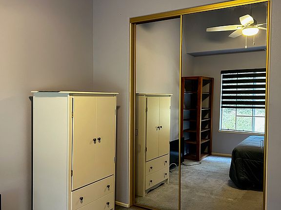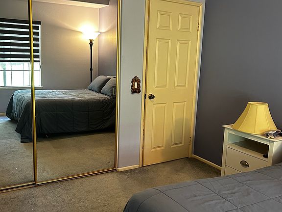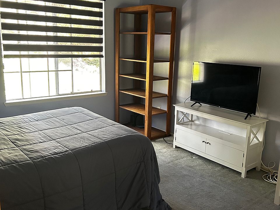Nice size Private room with good size private bath. Room is upstairs and is 12' x 11'. The Room has carpet on floor and bathroom has tile. Room faces a hill with trees and plants, etc. outside window.