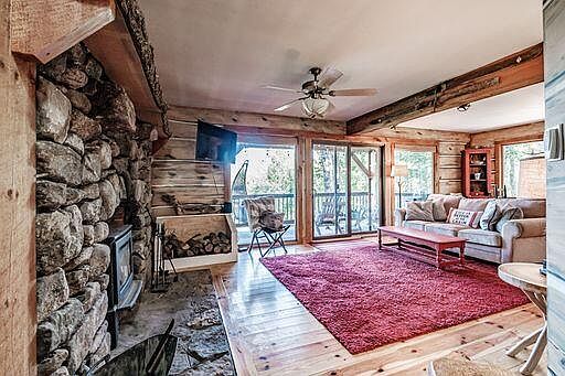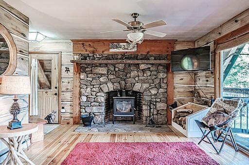 Escape to Your Private Retreat: Serene Cabin Nestled in the Woods. This charming Maine getaway offers tranquility on 10 acres of picturesque land, boasting both wooded seclusion and mountain views. Step inside to discover a cozy wood stove set against a floor-to-ceiling stone wall, seamlessly blending with the open living, dining, and kitchen areas. Enjoy the convenience of a full bath on the main level and relax on the spacious deck overlooking the landscaped backyard with a flagstone patio and fire pit. With potential for further landscaping and expansion, this home offers endless possibilities. Featuring bedrooms on both upper and lower levels, each with its own sitting area, and the lower level presenting polished concrete floors, there's ample room for customization. Whether you envision a B&B, a peaceful retreat, or a permanent residence, this property offers versatility and charm. Explore nearby lakes and Pleasant Mountain, with Portland just an hour away and Bridgton and North Conway within easy reach.