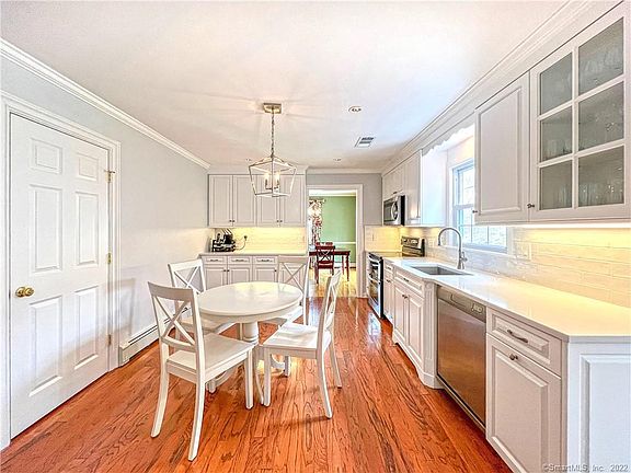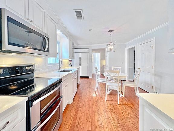 Welcome to 23 Holly Road New Canaan, CT. This charming and updated colonial is conveniently located on a desirable in town cul de sac, walking distance to schools and Kiwanis Park. This four-bedroom home has been updated and maintained for today's living. The first floor features all hardwood floors, sunny living room, private office/den with fireplace, and eat-in kitchen opening to a family room with wall of glass overlooking the backyard and deck. The recently renovated kitchen includes newer appliances, quartz countertops and bonus refrigerator/freezer. Upstairs, there are four bedrooms all with hardwood floors and recently renovated center hall bathroom. The primary en-suite bedroom features a new bath and ample closet space. Not to be overlooked is the recently updated lower level adding an additional 400SF of living space plus access to the two-car garage. A fenced in back yard with lush lawn, play area and oversized deck allows for warm weather enjoyment.
