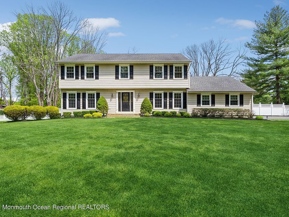 Classic Holmdel Colonial w beautiful curb appeal in prime location, backs onto private woods. Bright & airy 4 BR's, 2 1/2 BA home. Newer siding, windows, front & garage doors, HVAC & rear fence along w/refinished wood floors. There is a finished basement. First floor offers living/dining rooms adorned w/moldings & family room w/brick FP, built-ins & beautiful built-in garden window. Kitchen boasts center island, newer stove/hood & refrig. Oversized sliders leads to deck and free formed pool, making this home perfect for entertaining. First floor completed by laundry room &1/2 bath. Second floor offers generously sized bedrooms, newer main bath & a master w/ ensuite bath & walk in closet. Home is conveniently located near parks, plus highly rated Holmdel Schools!