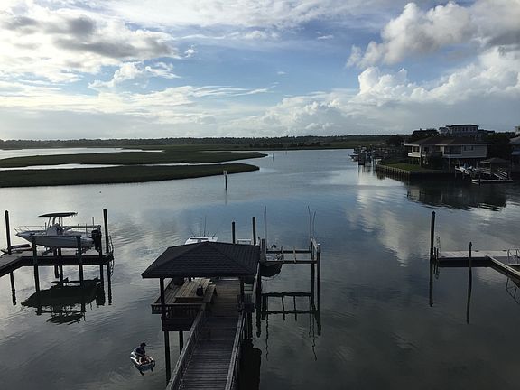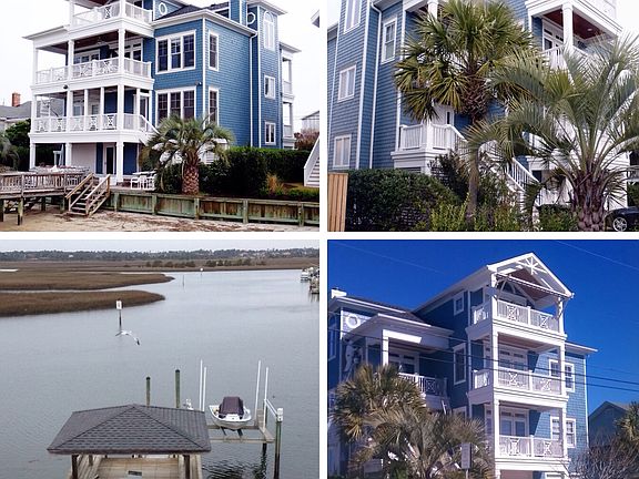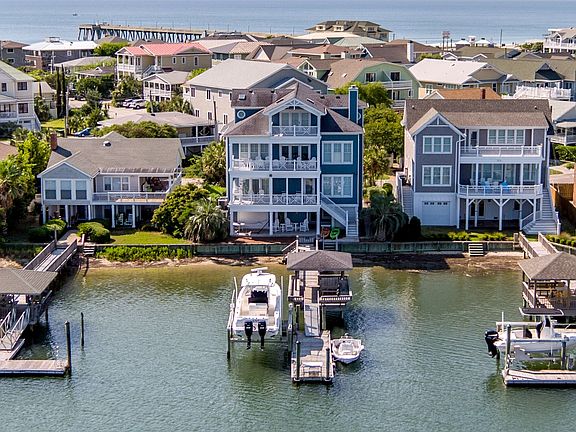 Grand waterfront beach home in Wrightsville Beach. One owner. Private dock, multiple slips including boat lift. 5BR, 5.5BA, 3 car garage, 2 large living areas and oversized rooms, beautifully appointed, furnished and spectacular sunsets. Whirlpool tub and tiled shower in master bath. There are 3 washers and 3 dryers and an elevator. All rooms and porches have beautiful water views.