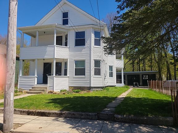 Equity-builder ready for completion. 1st floor is a 2-BR, 1 bath rented unit with TAW occupant. Keep that income coming to help fund the project completion or move into that unit and complete the project. Roof is <15 years old, new windows throughout, side and front porches, nice built-in china cabinets on 1st and 2nd floors, exterior siding is in great shape. Bonus: 4 garage bays allow you to keep all of your equipment or project supplies onsite. Huge dry basement with high ceilings, W/D hook-ups, FHW boiler, work area. 3rd floor holds potential to expand living area of 2nd floor unit, or even house a small 1BR unit. Would need skylights or dormers, as no windows currently in some of that area. Open access to plumbing and electricity to the 3rd floor. Buyer to perform due diligence with Town for 3rd flr expansion. Either way, this could be a nice little owner-occupant money-maker, a multi-gen property or an investment property if rented at 2BR market rental rates. Sold as is