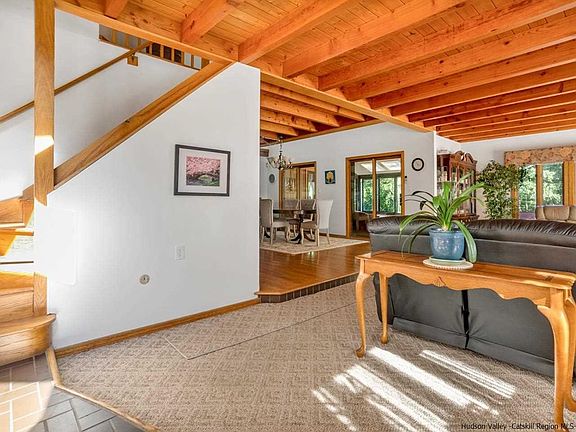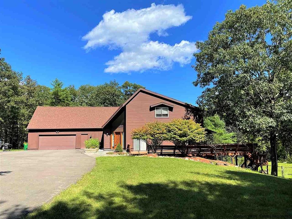 SPACE FOR EVERYONE! CUSTOM WOODSTOCK CONTEMPO, privately sited on 3 acres within an upscale enclave of other fine homes. A winding tree-lined driveway leads to 23 Lauren Ct. Enter through a carved wooden front door and from the foyer you view the open layout: Comfy living room, large kitchen, formal dining room and sunroom/family room with a vaulted ceiling and access to a 54-foot long wraparound deck that overlooks the rear yard with its vegetable gardens and wooded areas beyond the lovely grounds. A walk-in pantry and dedicated laundry room are off the kitchen and an en-suite bedroom with a substantial walk-in storage space complete the first floor. A staircase to the second level leads to a "dance-floor" sized landing with vaulted ceiling and skylight that overlooks the main floor and opens to 2 large bedrooms, an office/den/child's room, a full bath and a 22'x35' "bonus" room - currently used as an artist's studio. Super spacious 2-car garage and a whole house stand-by Generac generator are welcome features. Come enjoy a lifestyle of comfort, ease and privacy without isolation - minutes to the Zena Pool and Tennis Club, Shakti Yoga, Woodstock village, Kingston and Saugerties. Welcome to your Hudson Valley home!