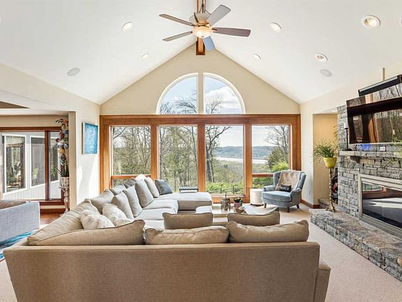 Custom transitional with gorgeous Ohio River views & 1st floor master suite! Privately set on a 6+ acre lot with heated saltwater pool & a relaxed, stylish vibe. Enhanced by walls of windows offering an abundance of natural light with sweeping river views plus premium new updates throughout including geothermal heat, 50 yr shingle roof, lighting, home automation & much more! A 5 car garage + 5 bedrooms- including a guest suite with kitchen - 4 full & 3 half baths + gorgeous outdoor living! Wow!