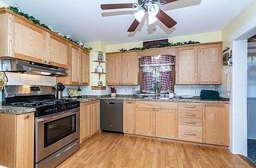 - Kit Dscrp: Main Level, Dining Area, Ceiling Fan(s), Flooring - Hardwood, Breakfast Bar / Nook, Kitchen Island, Stainless Steel Appliances, Remodeled, Exterior Access, Country Kitchen, Gas Stove