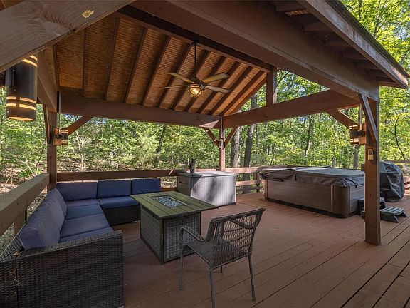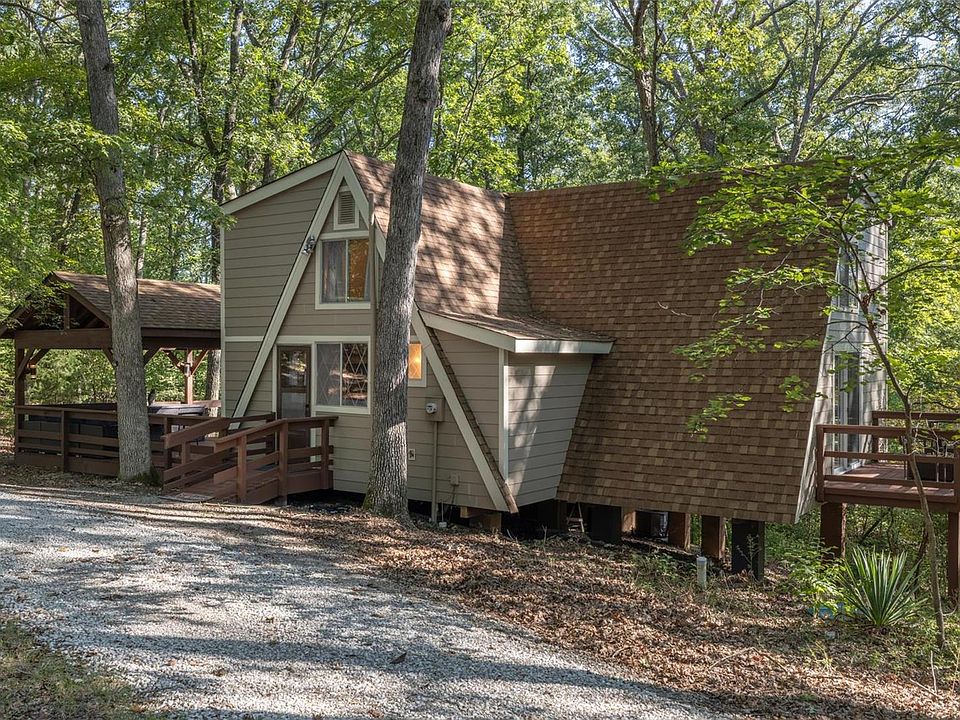 This delightful 3 bed and 1.5-bath chalet is a true gem, set on over 4 acres of lush forest in the heart of Innsbrook. As you approach, you're greeted by its charming exterior, featuring durable cement board siding. The freshly stained wrap around deck provides multiple outdoor spaces to unwind. Including a newer hot tub and gazebo! Step inside to discover a tastefully updated interior that maintains the rustic "A-Frame" charm. The renovated kitchen boasts custom cabinets and sleek granite countertops. The living room exudes warmth and coziness, anchored by a wood stove and cedar lined ceilings. Each of the three bedrooms is spacious and inviting. The large primary main floor bedroom features it's own private half bath. Outside, the expansive 4+ acre lot provides room to roam. Spend the evenings catching fireflies and roasting smores by the firepit. Mostly furnished and move in ready. Live your best life at 23 Lucern Oaks! *Not a rentable property.*