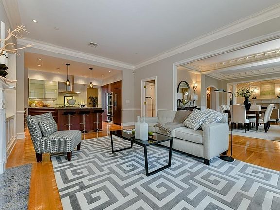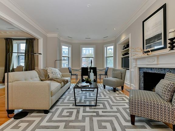 This dramatic and sophisticated floor-through home presents an exceptional opportunity on the first block of Marlborough Street. Spanning the width of two sunny-side brownstones with direct elevator access, the spacious residence includes four bedrooms with three-and-a-half bathrooms, including a truly luxurious corner master suite. The living and entertaining rooms are classically scaled with beautiful details that retain the timeless elegance of Back Bay. The formal living room, dining room and family room all enjoy front exposure with views of tree-lined Marlborough Street. The floor plan also incorporates a grand entry rotunda, beautiful wood paneled library with wet bar, gourmet Poggenpohl kitchen open to the family room, large den, mudroom, four fireplaces and two private balconies. Complete with extra storage and two parking spaces (one garage and one outdoor), this architecturally significant home offers something special for the discerning buyer.