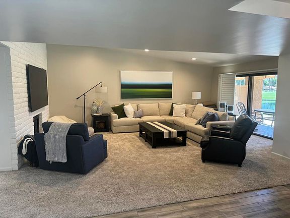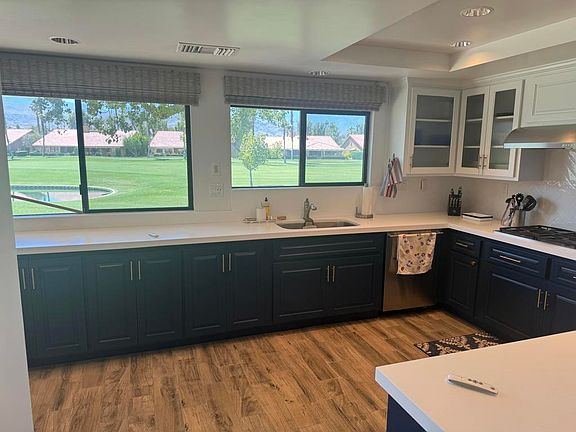 MUCH SOUGHT AFTER LOCATION!VIEWS, VIEWS, VIEWS!West mountain, fairway and lake, simply one of THE BESTDesert landscape with extended, tiled patio. TOTALLY REMODELED in 2021- wood plank style flooring, stainless appliances, gas cooktop, quartz countertops, shutters, bright white bathrooms with large showers, epoxy garage floor and TURNKEY FURNISHED!