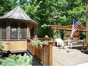 A very unique and inviting 3 bedroom contemporary in a quiet setting tucked between Mirror Lake and Lake Winnipesaukee; beautifully landscaped with a new 1000 square foot wrap-around deck with a screened gazebo and pergola. The home features hardwood and tile flooring, 2 granite fireplaces, an updated kitchen with new SS appliances, a master suite with a hot tub, soaring ceilings and lots of glass for a bright and cheeful interior, plus a 3 car garage with a finished, heated room above, perfect for worksho pr studio. This property is unusual and well worth seeing!