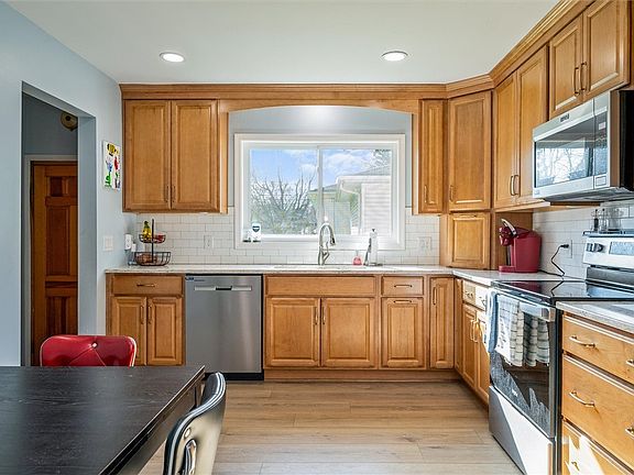Two Open Houses: Saturday and Sunday 11:30am-1:30pm!!! Welcome home to this beautifully updated ranch! First flooring living with high end upgrades. A completely renovated custom designed eat in kitchen with KraftMaid 42” Cabinets, soft-close cupboards, quartz counters and stainless appliances. Thought and craftsmanship were put into the main bathroom with custom tile and glass surround, gorgeous oversized vanity. The cozy living room is complete with a wood burning fireplace. Hardwood floors through out the large bedrooms. The basement is a great flex space for home gym, office or a playroom. A covered front porch and sidewalk lined street to enjoy in the coming warm months! Delayed negotiations until 4/17/2025 at 9am. Please allow 24 hours for review.