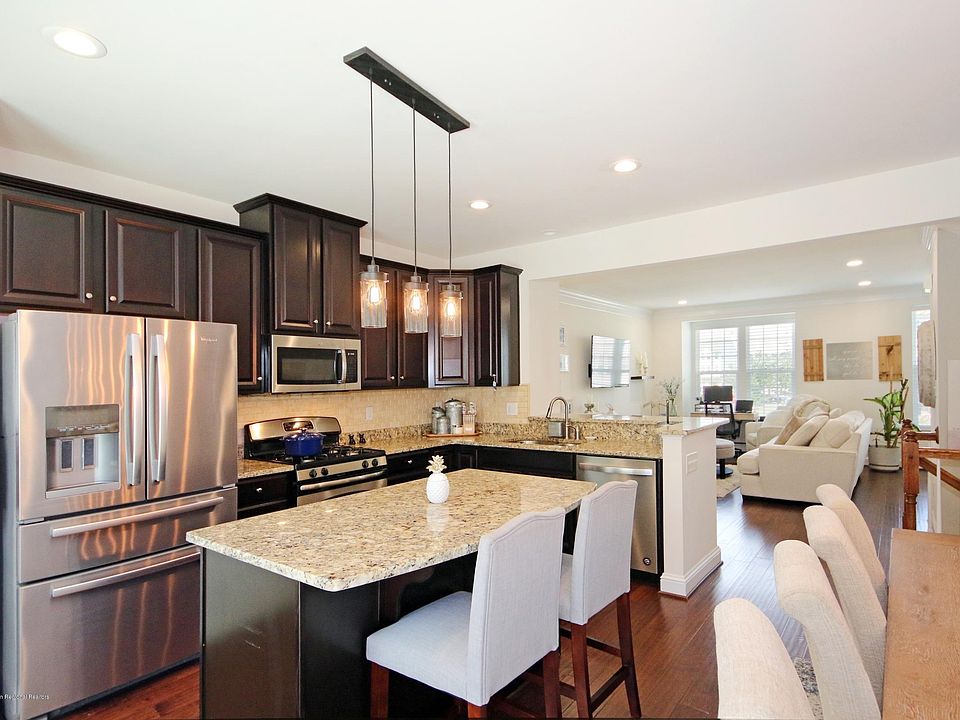 Live carefree at Rose Glen! Upscale & tastefully updated 3 story home. Sun drenched kitchen with center island & breakfast bar open to large living room. New dishwasher & microwave. Granite counters & beautiful backsplash. Stunning upgraded hardwood floors on second level. Deck with sliders overlook beautiful park setting. First floor enters into a large foyer with great room and gas fireplace leading to a patio with a grill pad for your outdoor cooking! The third floor has new Laminate pet flooring, new dual shower heads in Master bath, new recessed lights in Master Bedroom & fresh paint. The third bedroom has new fan & light. The garage door system is also new! Great location close to shopping, beaches, Parkway & Route 18.