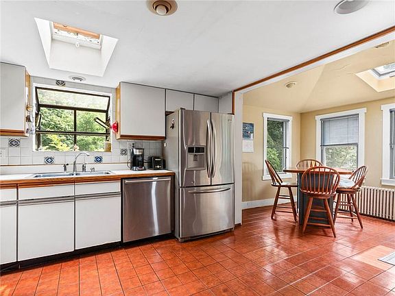 Adorable Bristol Cottage in a prime downtown location! Super walkable! Stroll to waterfront restaurants and shops, the Town Beach, East Bay Bike Path & recreation area! 5 mins from Colt State Park, sports complex and Roger Williams University! Open floor plan features a living room with fireplace and original wood flooring, a tiled kitchen & breakfast nook, plus an additional sitting/dining area. Kitchen includes stainless appliances, a gas range, skylight and a greenhouse window behind a double stainless sink. Adjacent is an inviting 1st floor master with exposed beams. 2nd floor offers 2 more bedrooms, offices, etc. Full basement with plenty of storage space. Outdoors is a 2- car garage, great for a gym or work area with off-street parking. Have breakfast or unwind on the shady porch overlooking a beautifully landscaped back yard! A charming home with a fantastic in-town location!
