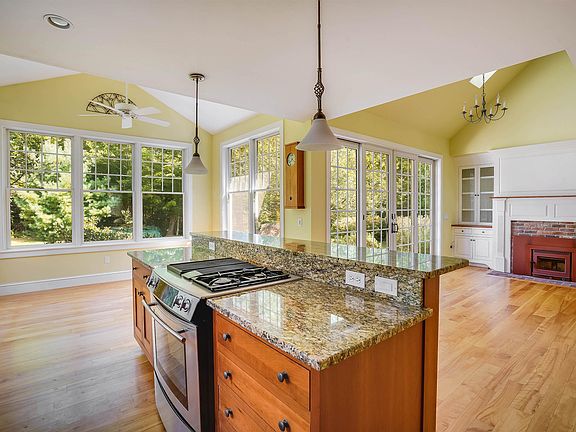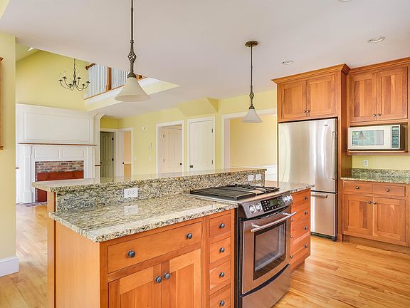 This custom built cape is an Old Hampshire Design boasting high quality craftsmanship. This 4 Bed 3 Bath custom-built cape is nestled on 3.84 acres in a welcoming cul-de-sac neighborhood. The 1st Floor Primary Bedroom Suite is a special treat, complete with a soaking tub, tiled walk-in shower, and walk-in closet. A 2nd first floor bedroom, could also be a den or office. Enter the front door and step into the heart of the home—the inviting living room, featuring cathedral ceilings, a cozy wood stove insert, and decorative mantel w built-ins. The delightful open kitchen boasts granite counters, island, and custom cherry cabinets, overlooking a sunny breakfast nook perfect for morning coffee. The formal dining room is ready for your next dinner party, with radiant heat keeping the first floor toasty. A half bath and laundry in the mudroom entry for convenience just off the heated 2-car garage. Upstairs, find two more bedrooms and another full bath, plus a large bonus room above the garage, ideal for a family room or guest suite with access from the 2nd floor or by it's own staircase. The full unfinished basement offers storage space or the potential for future expansion. Step outside to your beautifully landscaped backyard oasis, complete with a patio for summer BBQs, a fire pit area, and raised gardens—all surrounded by mature trees in a serene wooded setting. This home showcases a NEW ROOF & skylights, new Reeds Ferry Shed & more! Just 15 min to vibrant downtown Peterborough.