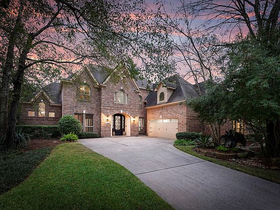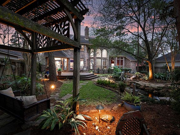 Tucked away beneath a canopy of mature trees on a generous lot, this beautiful brick home offers privacy, manicured landscaping and timeless curb appeal. The backyard is a true outdoor PARADISE featuring a serene Zen garden, koi ponds, Ipe decking and a pergola with a swing—perfect for relaxing and enjoying nature. Step inside to soaring ceilings, abundant natural light and classic architectural details throughout. The spacious entertaining layout includes a large dining room, a handsome study, a formal living room and a family room with a two-sided fireplace and a wet bar. The custom island kitchen offers soapstone counters, stainless steel appliances and an abundance of storage. A true retreat, the primary bedroom features an ensuite bath featuring double sinks and soaking tub. Upstairs, you will find a game room, 3 nicely sized secondary bedrooms, 2 full baths and a bonus flex room for media or play. IDEAL Woodlands location - Walk to Mystic Lake and exemplary Woodlands High School!