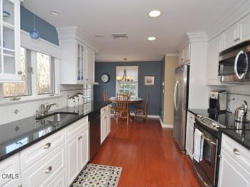 One of Ridgefields Most Popular In-Town Locations This totally renovated Saltbox style Colonial home combines sophistication and casual style. Freshly painted on the inside and out, the completely renovated kitchen, built-in cabinetry, updated bathrooms, new doors, beautiful hardwood floors and high-end upgrades make this home a rare find on nearly 1 private acre in the heart of the Village. From the Front Door, enter this warm and inviting home. The Living Room, with hardwood flooring, crown molding, fireplace and beautiful custom built-ins opens to a lovely Dining Room with French style doors to the large deck. Open to the Living and Dining Rooms is a gorgeous sun-lit family room with wall of new windows overlooking the private yard and French doors to the deck. The eat-in Kitchen, accessible from the front entry foyer or the Dining Room has been magnificently redone with no expense spared. Designed with efficiency and style in mind, the Kitchen boasts custom granite countertops, ceramic backsplash, high-end stainless appliances, and white Kraftmaid cabinets. The breakfast area offers a lovely view of the hardwood deck and a French door. Spanning the rear of the home, the deck provides the perfect entertaining spot, complete with retractable awning. A charming powder room with beadboard and vintage inspired tile completes the first floor. The second floor features a Master Suite with his and her closets and a beautifully renovated Master bath complete with double vanity, bath/shower with glass doors and skylight. There are two additional bedrooms and a beautifully renovated guest bath with beadboard, hardwood vanity and ceramic tile. A finished lower level features a beautiful French style door to the yard, a laundry area with new, premium washer and dryer, ample storage and additional living space plus access to the pristine two car garage. New Kitchen and baths, six panel interior doors, new knobs and hardware, window blinds, new hardwood flooring and refinished original hardwood, exterior lighting, gutter guards, and new electric awning on deck are just some of the improvements the current owners have added. The home also features town water and town sewer. Move right into this fantastic home is just steps from the park, schools, shopping and beautiful downtown Ridgefield. Live the Dream!