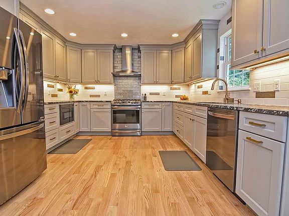 - Kit Dscrp: Flooring - Hardwood, Countertops - Stone/Granite/Solid, Breakfast Bar / Nook, Recessed Lighting, Remodeled, Crown Molding