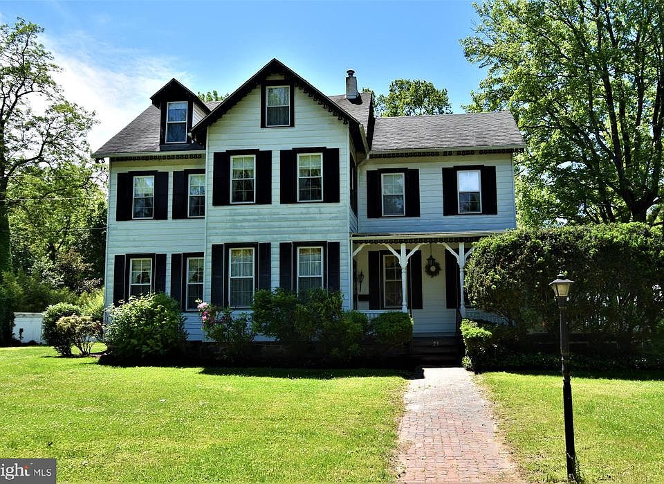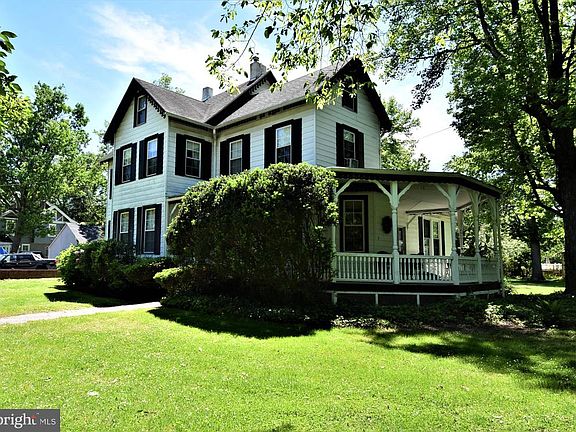 Spacious late 1800's 3 story, 6 bedroom, 3 1/2 bath colonial with basement, wrap around porch and 2 car garage/barn on a large open lot on a quiet street in desirable Burlington Twp. This home combines historic charm with modern convenience and is located a stones throw from the Delaware River. First floor features a formal foyer with a unique curved staircase, formal living room, modern kitchen, dining room, huge 24 x 18 family room with beamed ceiling, a lot of windows and a sliding glass door that leads to the wrap around porch, 22 x 13 library that could be a 1st floor bedroom, laundry, full bath and a 2nd back staircase. Second floor has a foyer, 4 bedrooms and 2 full baths. Third floor has 2 bedrooms, playroom, powder room and a huge walk in cedar closet. The unfinished basement features a walk up outside entrance and wine cellar. High ceilings, panel doors, gorgeous built ins, wood floors and ornate crown and casings complete the picture. The open lot is just under an acre with a long asphalt driveway that leads to a 2 car garage and barn/workshop. Minutes from Rt 130 and the Burlington Bristol Bridge.