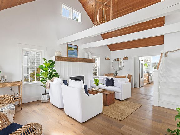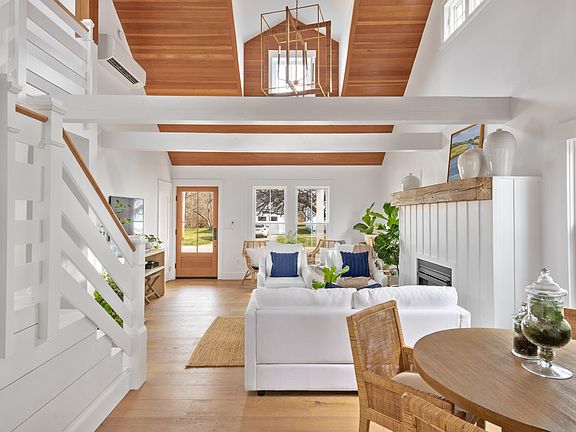 In a highly coveted Falmouth seaside neighborhood where charming homes, sun-filled lots, ocean breezes, and after-dinner strolls along the shore are abundant, this stunning Nantucket-style home has been completely renovated, and a two-level addition added to create a very rare offering. A dramatic Douglas Fir 16-foot cathedral ceiling adorned with two large dormers fills the house with natural light enhancing a coastal aesthetic that will make you feel like you are on vacation every day. Fresh shades of crisp white colors, antique gold light fixtures, and white oak hardwoods throughout are just some of the cutting-edge appointments making this a turn-key home. There is a new chef's kitchen with custom Harlan cabinetry, quartz counters, Forno appliances, and a door to a flat, south-facing backyard. Three levels of living space, including a first and second-floor primary suite and 4.5 new bathrooms with designer tile and quartz, have been meticulously floor-planned to maximize every inch of storage and living space. A truly turn-key home with All New: roof, insulation, electrical, plumbing, heating and cooling, gas fireplace, finished lower level, covered front porch, and a one-car garage with a drive-through door to the back yard ideal for those with large equipment or a boat. Located just minutes to Falmouth's shopping, boating, restaurants, and commuting, as well as just 10 minutes to downtown Portland.