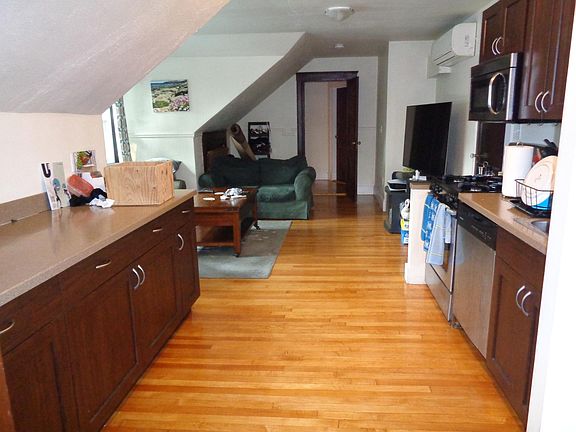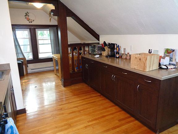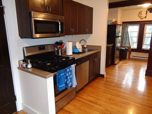 Immaculate, young & open finished attic space. Inviting top (3rd) floor of very good looking 3 fam see's you get a landlord who's very proactive and has already done all the upgrades you can ask. Swanky kitchen with a full slate of stainless steel appli-s, extra cabinet and counter space (on 2 sides). Near perfect hardwood floors. Smallish living room. Beds are good sized, Double closets to be had. Updated bath to enjoy. All new double sealed heat efficient windows at every corner. Great sunshine. Overall, as 2beds go this one is smallish (just 4 rooms + bath). Laundry is provided for via coin-op in basement. 2 car assigned parking in drive and noone blocks. Easy basement storage is all yours. OH yes, and enjoy CENTRAL AIR ALL AROUND ! Start date is August 1 to August 15 latest, Reduced half month fee (only). 1 small pet considered (up to 25 LBS). 1 year term at a time. Call Jack Lambergs, Ingram Realty washer/dryer included
