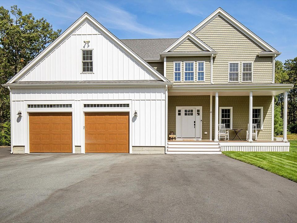Stunning custom 3 bedroom 3 bath home built in 2022, has been meticulously cared for & feels brand new! Nestled perfectly on this private lot that is just under 3 acres of land. Home is in Mashpee, w lower tax rate, but located on the Sandwich line, close to both Peter's and Wakeby Pond. As you enter the property down the long paved driveway, you will notice the spectacular curb appeal w Azek farmers porch, lush green grass & mature plantings. The oversized driveway has plenty of room for parking, as well as an additional area for a boat/trailer/RV. Bright & inviting entry way opens to foyer & sitting room, w beautiful hickory wood floors throughout. Gorgeous kitchen w oversized island, granite counters, stainless steel appliances & pantry is great for everyday use w the family or entertaining guests. Sun splashed living room w gas fireplace & slider to back yard w patio. First floor also has a full bath & access to the large 2 car heated garage w built in storage & workspace. Spacious primary bedroom has both regular & walk in closets as well as full bath. En suite bath has 2 separate vanities, large soaking tub & oversized walk-in shower. Second floor complete w 2 bedrooms, one w walk in closet, & a full bath w double vanity. Plenty of storage in the full basement w 9 ft foundation that has a spray foam insulation for vapor temperature barrier. Home also boasts a generator, irrigation system, 20 x 10 shed, tankless hot water heater, gas heat & central air. A must see!