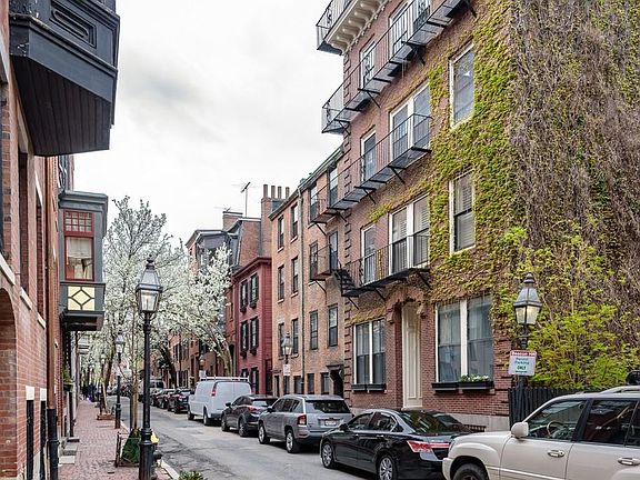 Elegant third floor two-bedroom home set on picturesque Pinckney Street in a 6-unit c.1865 rowhouse building. The open living/dining area features a fireplace and slider doors that open to the rear deck which has unobstructed views. Master suite with fireplace, walk-in closet, and renovated tiled-shower bathroom. Second bedroom with wall of built-in shelves and Jack-and-Jill bathroom. Gas cooking, central air, and in-unit laundry. Hardwood floors throughout. Steps to Boston Common, Charles Street dining and shopping, MGH, and Downtown Crossing.
