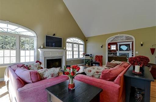Grandly sited on its 2+ acre lot, this home is spacious, bright and airy, and is located in an area of more expensive properties. Architectural details abound, including 9' ceilings on both levels, crown molding, custom built ins, dramatic windows, vaulted ceilings, French doors and more. Stunning sunroom addition (2007) features radiant heat ceramic tile flooring, gas fireplace with granite surround, custom mantle & built-ins, vaulted ceiling w/skylights, walls of windows and sliders to deck & private backyard. Spacious kitchen with brand new stainless appliances, corian countertops and Palladian window; oversized family room with gas fireplaces, wood floors and vaulted ceiling. Master bedroom with 2 walk-in closets and spa bath invite respite at the end of a long day. Practical amenities feature newer roof (2009), newer AC condensers and irrigation system with private well. With close proximity shopping, highways and conservation trails, this home is sure to delight!