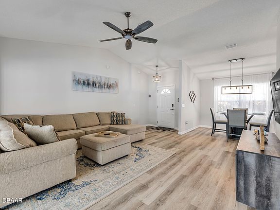 Welcome to this charming 3-bedroom, 2-bathroom single-family home in beautiful Palm Coast, Florida. NEW AC 2024. With 1,540 square feet of living space, this home offers a spacious and inviting layout that is perfect for both everyday living and entertaining. Upon entering, you'll be captivated by the soaring vaulted ceilings and the open flow that seamlessly connects the living room, dining room, and kitchen. The kitchen is a chef's dream, featuring solid countertops, ample cabinet space, a convenient breakfast bar, and sleek stainless steel appliances. Just off the kitchen, you'll find the formal dining room, ideal for hosting family gatherings or special occasions. The primary bedroom is a peaceful retreat, complete with tray ceilings and an en suite bathroom that offers dual sinks, a walk-in shower, and a large walk-in closet. The two additional bedrooms are located on the opposite side of the home, providing a split-bedroom layout for added privacy. The true highlight of this home is the outdoor oasis, which boasts a spacious, screened-in lanai perfect for relaxing or entertaining. The inground pool is the centerpiece of the private, fenced-in backyard, offering plenty of room for outdoor activities. Additionally, the pool house adds extra convenience and functionality to this fantastic outdoor space. This Palm Coast home is a true gemdon't miss the opportunity to make it yours! Mortgage savings may be available for buyers of this listing.