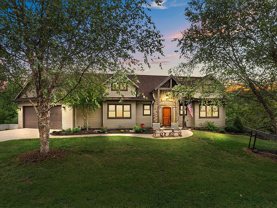This is IT! The TRL lake home you have been waiting for! This custom Tom Caruso-built one-owner home is loaded with exceptional quality and thoughtful details, and all the refined rustic charm you could ever want in a lake retreat. From the moment you step inside, the Great Room concept with rich wood accents gives you that unmistakable ''we're at the Lake, we can 'relax'' feeling.Enjoy not one, but two decks perfect for soaking in the fresh Ozark mountain air. The cozy living room with a wood stove sets the tone for relaxing evenings, while the chef-inspired kitchen is designed for cooking, entertaining, and creating lasting memories.The primary suite is truly a retreat after a long day on the water, while the spacious layout provides plenty of additional rooms for friends and family to have and enjoy their own privacy and space. There's also a family room complete with an efficient wood burning stove, plus a lower level completed with a bunk room & entertainment area to keep everyone entertained and happy with its own private entry--ideal for guests, hobbies, or even creating your own getaway within a getaway. And talk about peace of mind--this home comes with a brand-new HVAC system and water heater. Don't miss the bonus room for even more flexibility and space!And the cherry on top? A coveted boat slip is available in the neighborhood for additional $$.This home checks all the boxes for lake living--space, character, price and versatility. All that's missing is you!