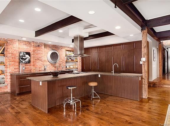 A finalist in the 2022 HGTV Ultimate House Hunt contest, this beautifully renovated luxury condo has a blend of modern and turn of the century architecture in the heart of downtown Asheville. Step into this exquisite home and take in the original exposed brick, beautiful Biltmore Estate hemlock floors, unique built-ins, steel beams and floor-to-ceiling wood trusses that create a relaxed urban feel. Entertain in the chef's kitchen with leathered granite countertops and a spacious island with breakfast bar. Relax in the bright, inspiring living area with city and mountain views from every window, or settle in for a movie in the home theatre in the raised den. Take the custom staircase with wrought iron railings by B&R Welding and hickory stringer stairs by Jack Plemmons to a semi-circular concept upper level with two bedrooms, two bathrooms, a laundry hallway, and access to a private 2,000 SF deck with breathtaking city and mountain views.