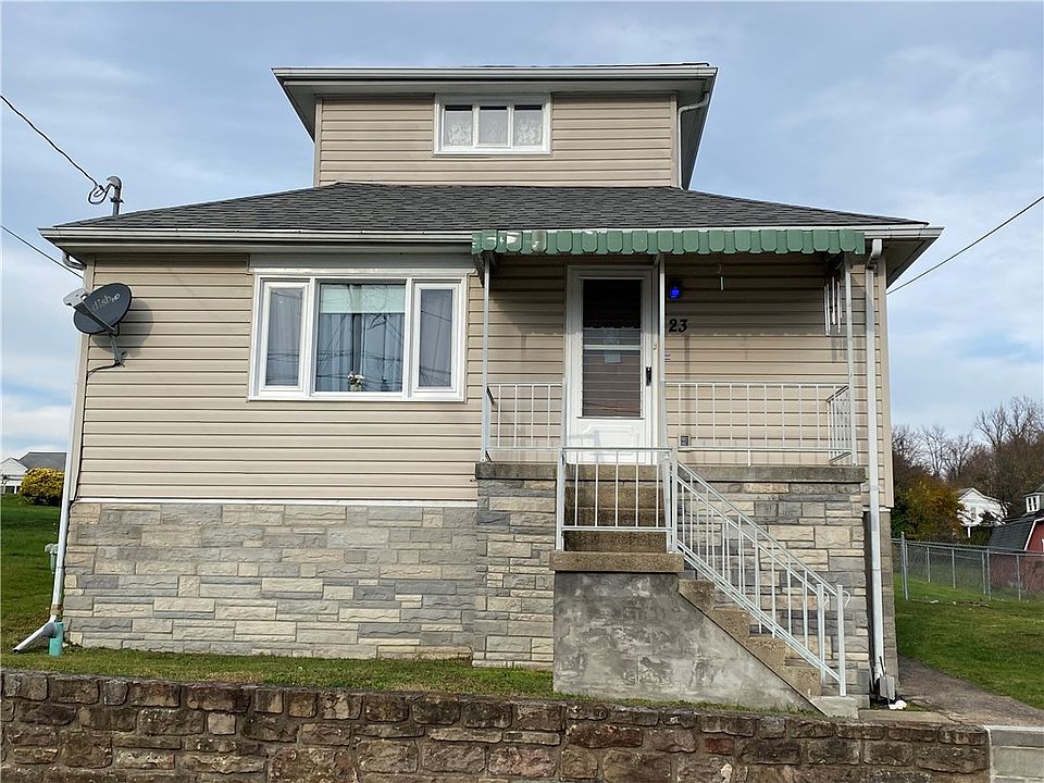 This cozy 2 possible 3 bedroom home is conveniently located near Rts 40 and 43 in Brownsville School District. Home features are a large kitchen with tons of cabinets, gas fireplace, huge upstairs bedroom, fenced in back yard, 2nd full bathroom downstairs, newer boiler and hot water tank. There is a lot of room for storage in the detached garage, basement and under the front porch. Extra parking in the rear off the alley. Home Warranty included!