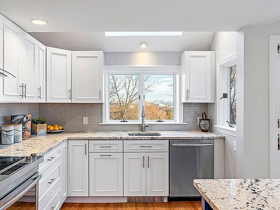 Stately Belmont Hill colonial in prime location offers great space, additional land, abundant light, hardwood throughout & spectacular views of the Boston skyline from every floor! First floor features classic front-to-back living room with wood-burning fireplace & french doors that open to an inviting, east-facing sun-room. Traditional dining room with wainscoting & built-in hutch leads to the home's focal point: a stunning 2018 kitchen with city views that wow, plus sliders to a deck perched above the landscape. A home office with tree-top views & half bath complete this floor. Upstairs are 3 spacious bedrooms, including a master with bath and another with beguiling alcove play area. Lower level features a huge basement with plentiful storage, full-size windows, fireplace & walk-out to a covered stone patio. With its expansion potential, plus some additional updating, this could be your forever home. Easy access to Belmont Ctr & Route 2. Open house Fri, 5:30-7, Sat & Sun, 12-2.