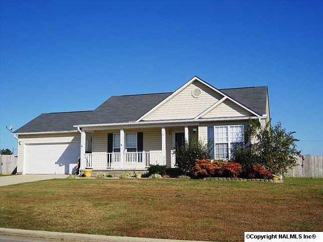 HARTSELLE AREA - Country living on a quite cul de sac for families & singles. This home is ready for you to occupy. A large fenced yard for pets & children, large garden, etc. A storage bldg for storing outdoor lawn equipment or other items. This home features a large open living room w/vaulted ceiling open to the dining room & kitchen. There are 3 bedrooms w/2 baths. One in the master bedroom. The master has a large walk in closet. A 2 car attached garage w/attic storage. Covered front porch.