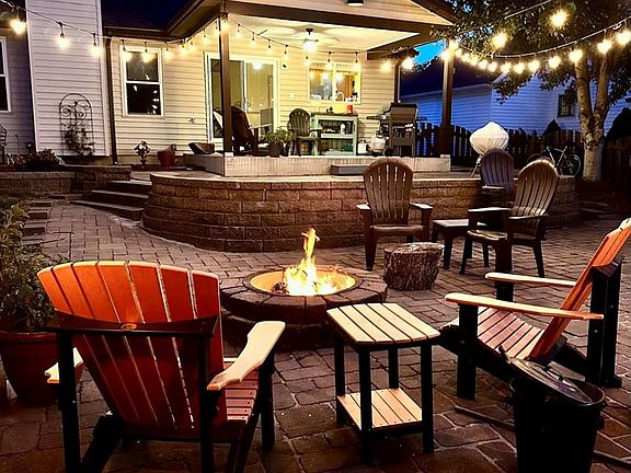 The back yard has a covered patio, a lower paver patio with fire pit, and a fenced in yard. This is great for the kids to play while the parents relax.