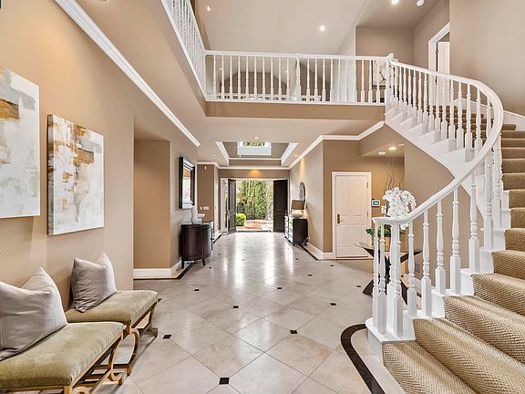 Sophisticated estate located in sought-after Round Hill Country Club. Boasting an expansive floor plan of approx. 5511 square feet with 4 bedrooms, 4 1/2 baths plus a large office/5th bedroom with en suite bathroom on the main floor and a sizable bonus room on upper level. Enter through the grand foyer with high ceilings and find a versatile open floor plan featuring a beautiful winding staircase with a gallery overlook. Nearly $600k in custom renovations throughout including solar(owned), sound system, kitchen, primary bath, 2 upper baths, powder room, hardwood, carpet, paint, pool heater and drip system on hill. A highlight is the kitchen, showcasing a large quartzite island with prep sink, custom white cabinets, SubZero refrigerator, two beverage drawers, Thermador six burner stove with a warming shelf, coffee nook, two dishwashers, microwave drawer in the island and spacious walk-in pantry. Enjoy casual dining in the eat-in kitchen, or entertain in the large formal dining room. Bar area features an ice-maker and wine fridge. Garage offers space for 3 cars plus room for a golf cart or additional storage. Step outside through one of the many French doors that open to the resort-like backyard with pool, spa and grounds to enjoy CA living. An entertainer's dream!