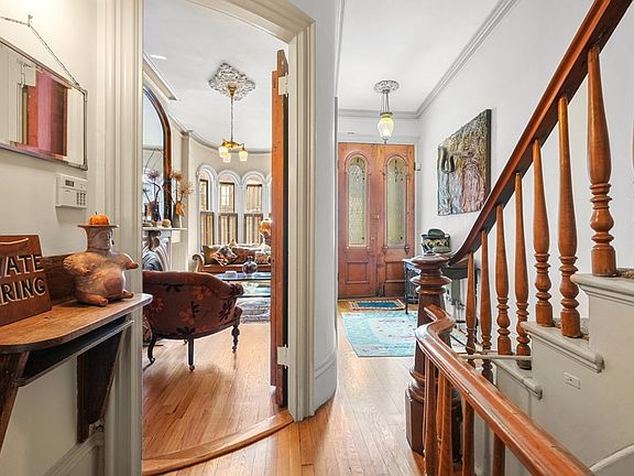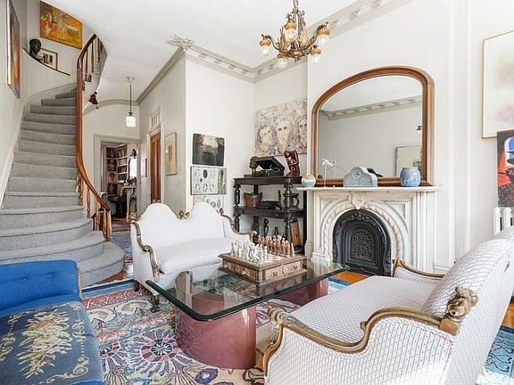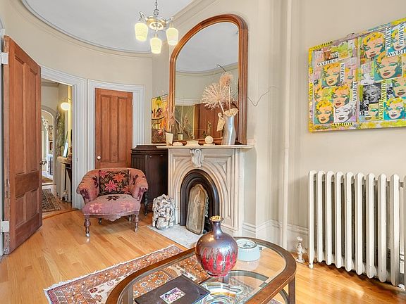 Venetian Gothic beauty located on much sought after South End square. This home, lovingly maintained by one owner for over 51 years, is filled with original detail; marble mantels, crown moldings, wood casings & doors. The entry level has a gracious sitting room ideal for receiving guests. This level then leads to the intimate library with wood burning fireplace. The garden level kitchen has gas cooking & a large informal dining area with walk-out patio. This level is completed with a full laundry, half bath and great storage. The front parlor is open & sun filled and the floor continues to spacious bedroom or home office/study. The second level has a sun-filled living room and a bath with a claw-foot bathtub. The third floor bedroom level has two spacious bedrooms and all tile shower. Top floor oasis family room with views of the Prudential & downtown, & a walk-out balcony. Open front to back, this is a special space for family to gather. Two full parking spaces and more.