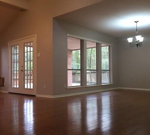 Great up front Woodlands location with easy access to I-45 & Hardy, Market street, dining, and shopping just minutes away! 4/2/2 single story in quiet cul-de-sac. Updated Island kitchen with glass tile back splash, stainless oven, neutral floor tile and counters. Large living room wit high ceilings & wood floors. Tons of natural light. Roof replaced 2017. Over sized backyard with large deck and covered patio. Zoned to sought after Woodlands schools!