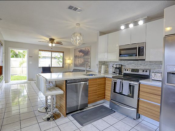Modern 2 bedroom 2 bathroom house with an open concept living space in a central location. Located east of I-95 and less than a mile from US-1, this house allows you easy access to tons of shopping and conveniences while being less than 2 miles from the beach. It is also only 1 mile from the Village of Gulfstream and 2 miles from the Aventura Mall. This unit is part of a duplex. The other unit is occupied by a very nice, quiet tenant who has been there for more than 10 years. The two units have a fire wall between them and share a fenced in yard. Each unit comes with two designated parking spaces, individual laundry rooms, and separate front and back doors. The property is located at the end of a cul-du-sac providing a safer and quieter street to live on. The unit has been used as a vacation rental since 2017 and comes fully furnished. A new AC unit was installed in this unit within the last 2 years in addition to high impact windows and doors. Owner will pay first month of water. Renter will be responsible for Electric and Water. No Smoking allowed. Up to two pets total allowed. Lease term is negotiable with a minimum of 6 months.