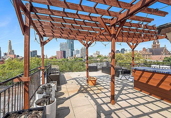 Garden lovers' delight! This lovely 1,100 square foot apartment comes with a private 1,000 square foot deck with fully mature plantings of gorgeous flowers, berries and fruit. Wisteria shades one outdoor room, a six-foot diameter table forms the hub of another. Two more outdoor rooms provide vegetable and flower focal points. Fruiting cherry, fig, and mulberry trees produce delicious crops, as well as blueberries, strawberries, raspberries, blackberries and grapes. Vegetables thrive! Save money growing your own arugula and herbs -- pinch a bunch of dill for your omelet. No time for gardening? No worries, the automatic drip watering system takes care of the plants for you. The roof garden is engineer-rated for 100 people in addition to the extensive plantings -- the perfect spot for sophisticated entertaining, with views of New York Harbor and Manhattan. This is a classic brownstone apartment with two bedrooms, including a large master bedroom. The master bath has a luxurious two-person jetted tub, glass block, and glass tiles. An airy, spacious living room and open-plan dining room create terrific flow. Corian counters and a commercial-grade stove enhance a lovely oak-cabineted kitchen, with a tile backsplash. Hardwood floors and 9.5 foot ceilings throughout.